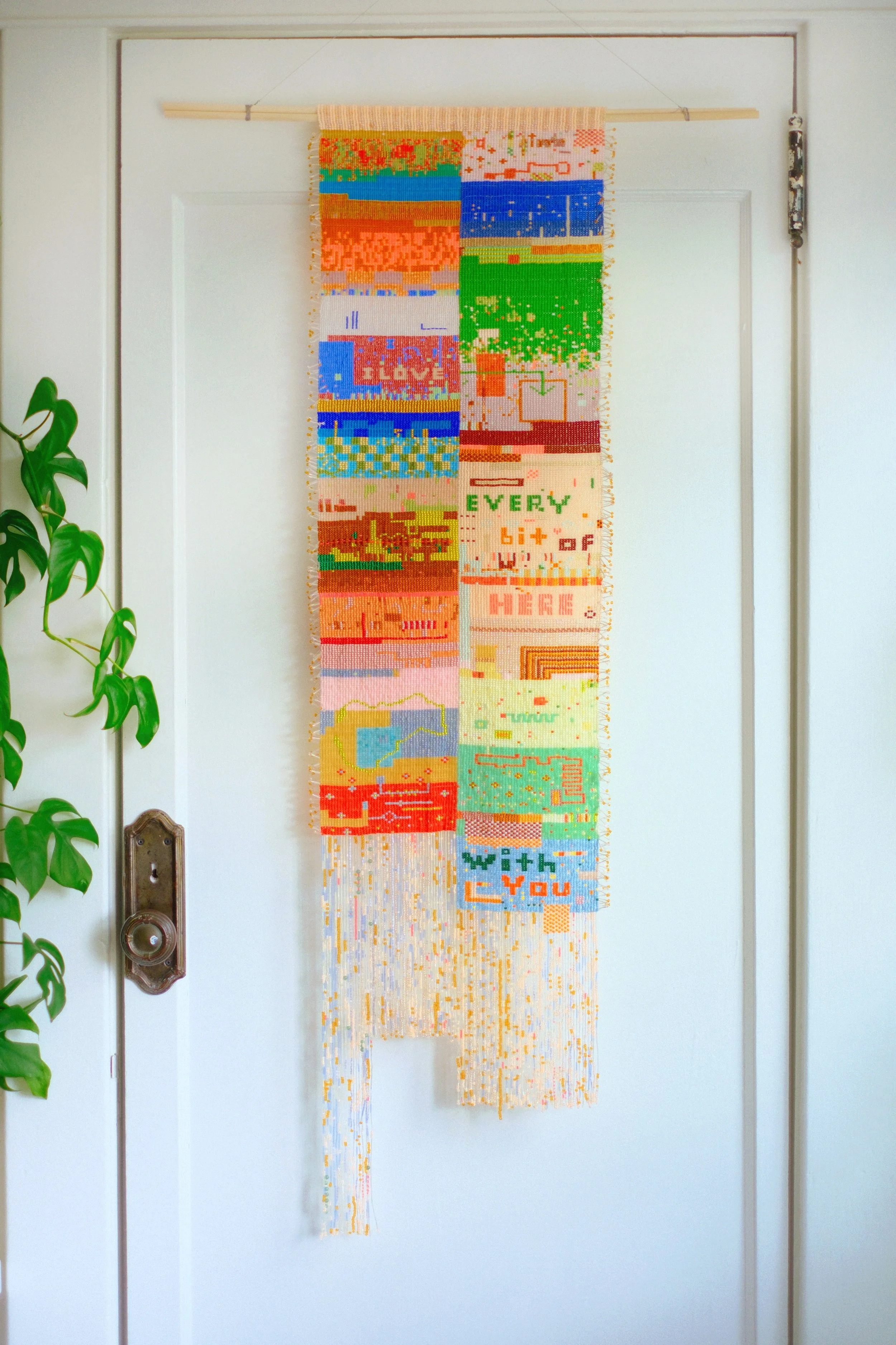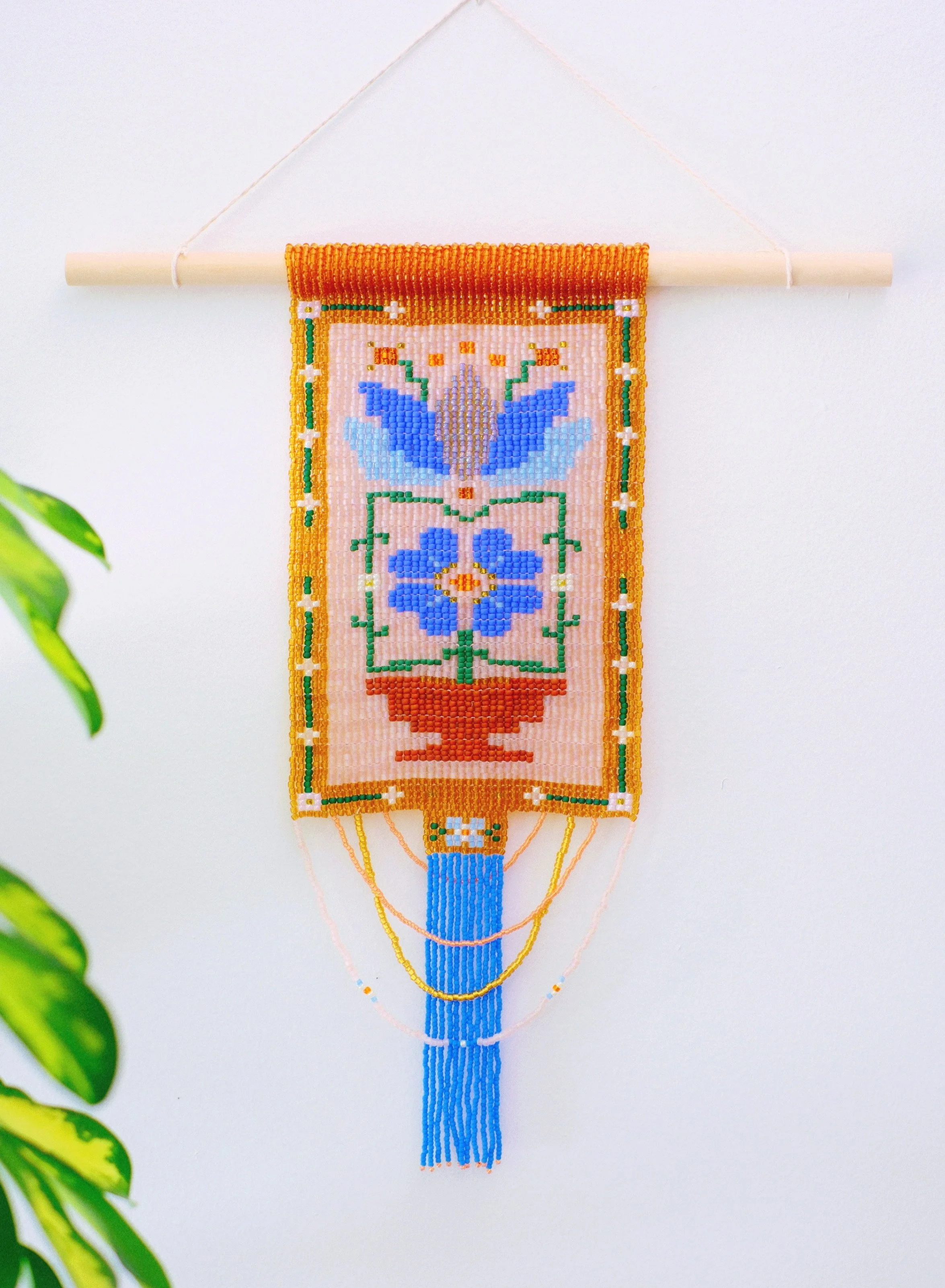 Glass seed beads and nylon thread on wood dowel
